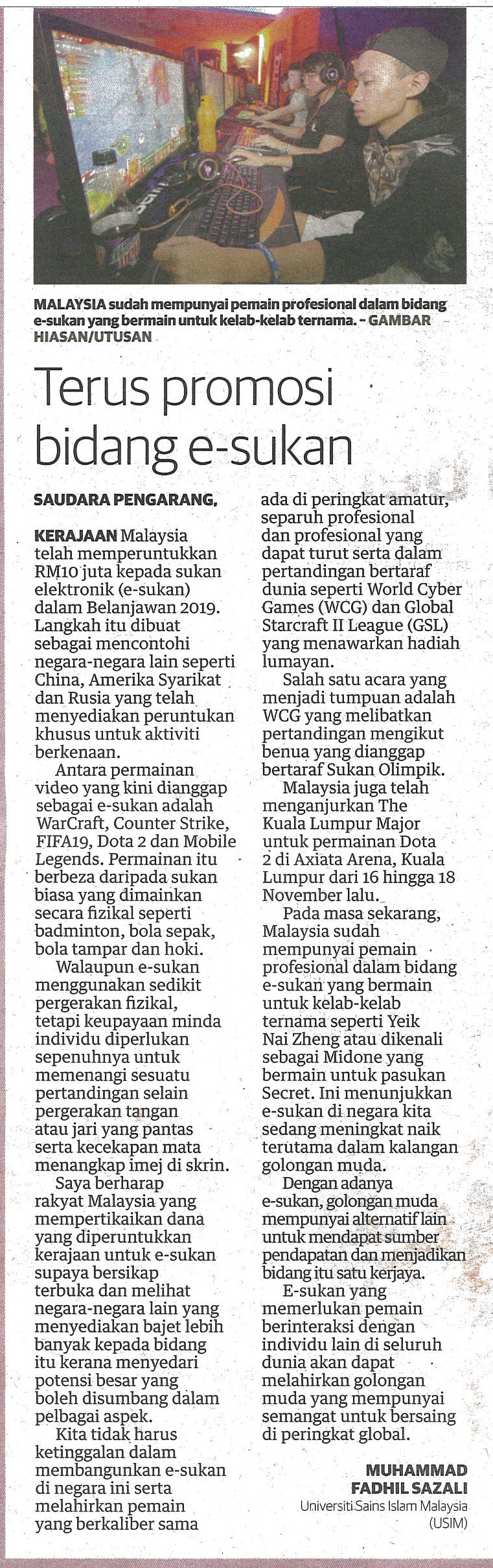 UTUSAN MALAYSIA 28 DISEMBER 2018 MS 19 TERUS PROMOSI BIDANG E-SUKAN.jpg