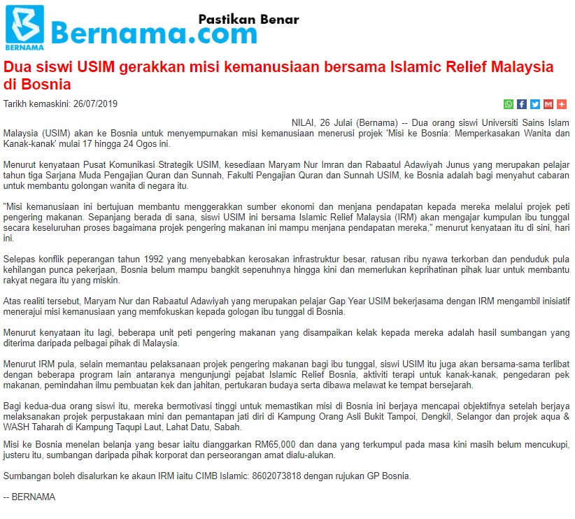 Dua Siswi USIM Gerakkan Misi Kemanusiaan Bersama IRM Di Bosnia