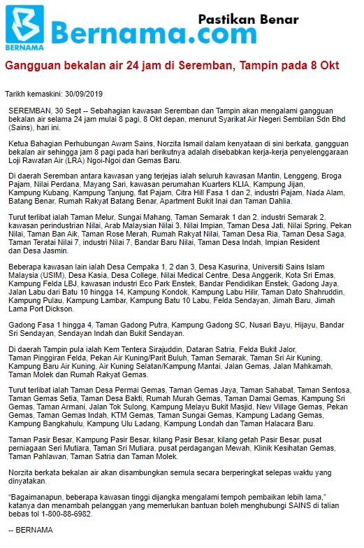 Gangguan Bekalan Air 24 Jam Di Seremban, Tampin Pada 8 Oktober
