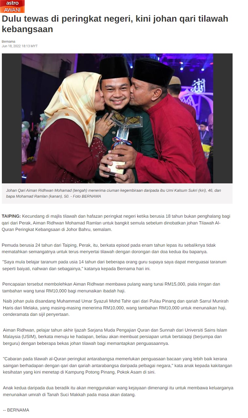 Dulu Tewas Di Peringkat Negeri, Kini Johan Qari Tilawah Kebangsaan