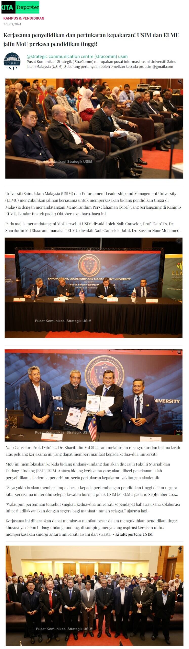 Kerjasama penyelidikan dan pertukaran kepakaran USIM dan ELMU jalin MoU perkasa pendidikan tinggi