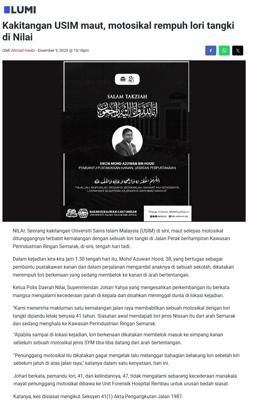 USIM MAUT, MOTOSIKAL REMPUH LORI TANGKI DI NILAI