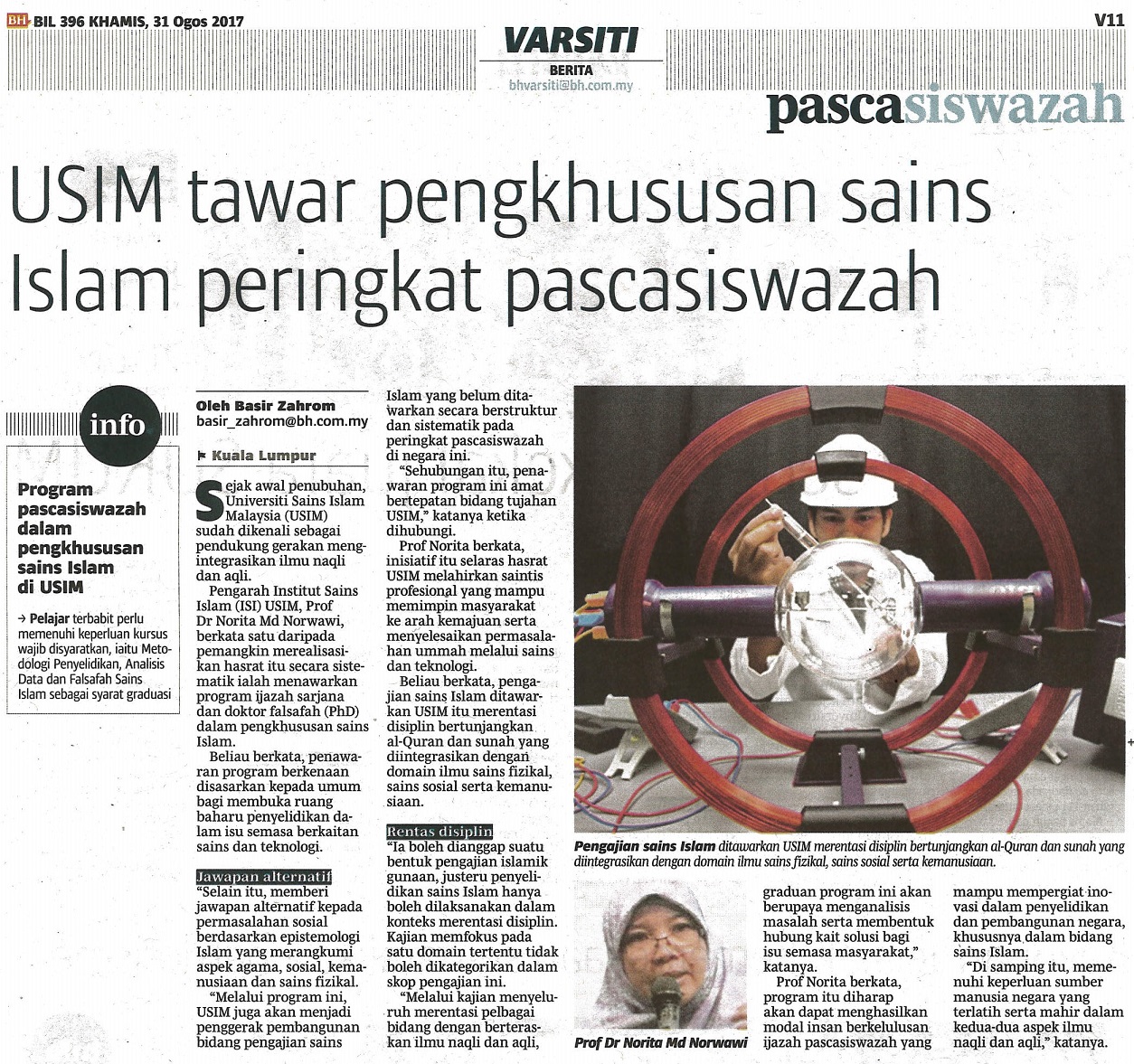 BERITA HARIAN - USIM TAWAR PENGKHUSUSAN SAINS ISLAM PERINGKAT PASCASISWAZAH, 31 OGOS 2017, MS V11 (VARSITI).jpg