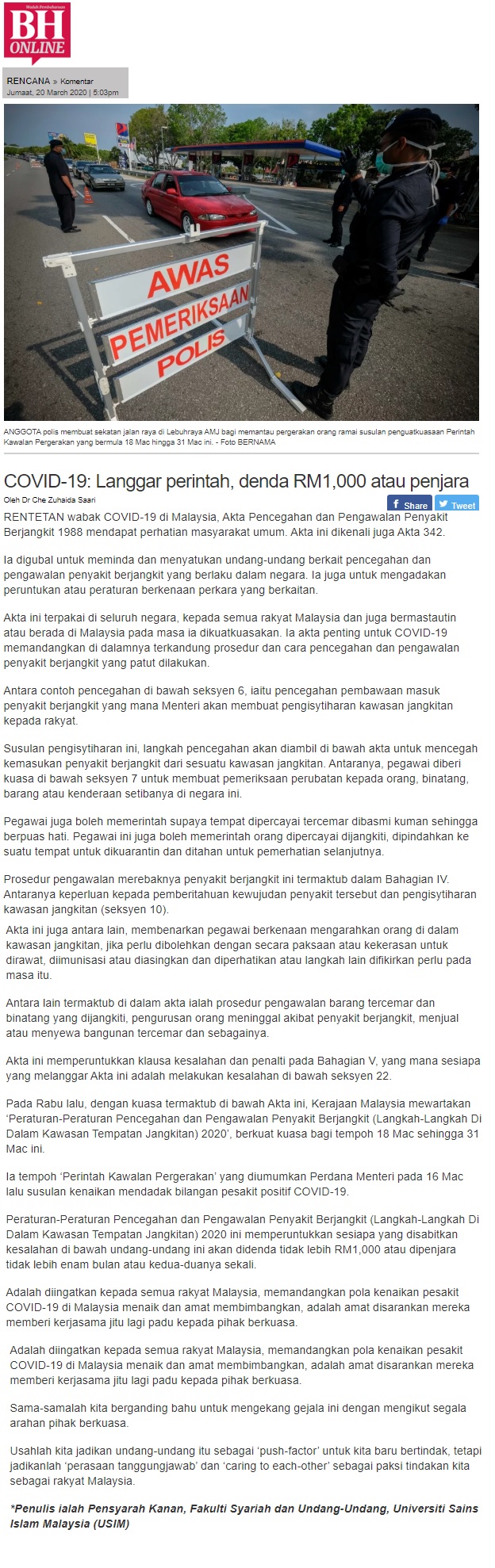 Covid-19 : Langgar Perintah, Denda RM 1000 Atau Penjara