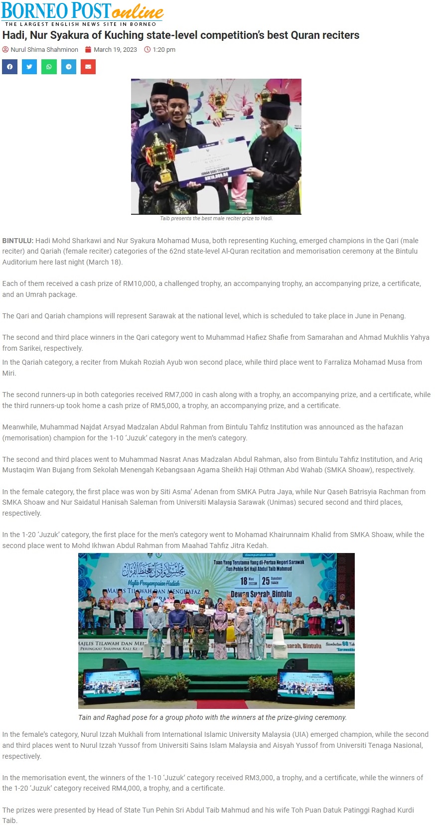 Kuching's:Hadi, Nur Syakura best Quran recites in state-level competition