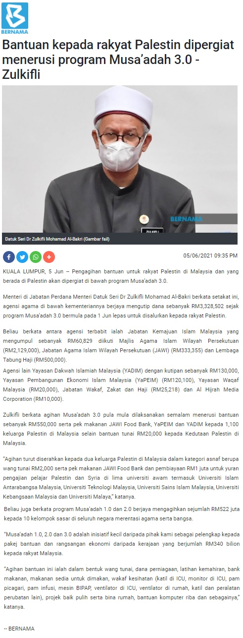 Bantuan Kepada Rakyat Palestin Dipergiat Menerusi Program Musa'Adah 3.0