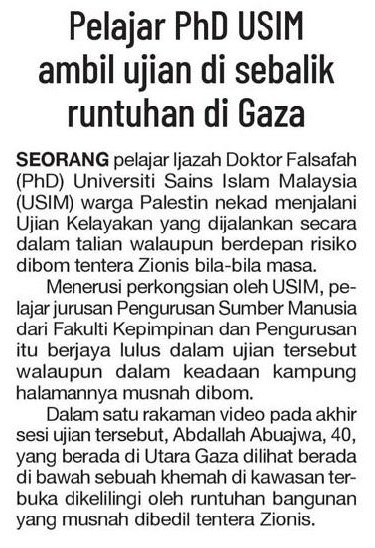 Pelajar Phd USIM ambil ujian disebalik runtuhan di Gaza