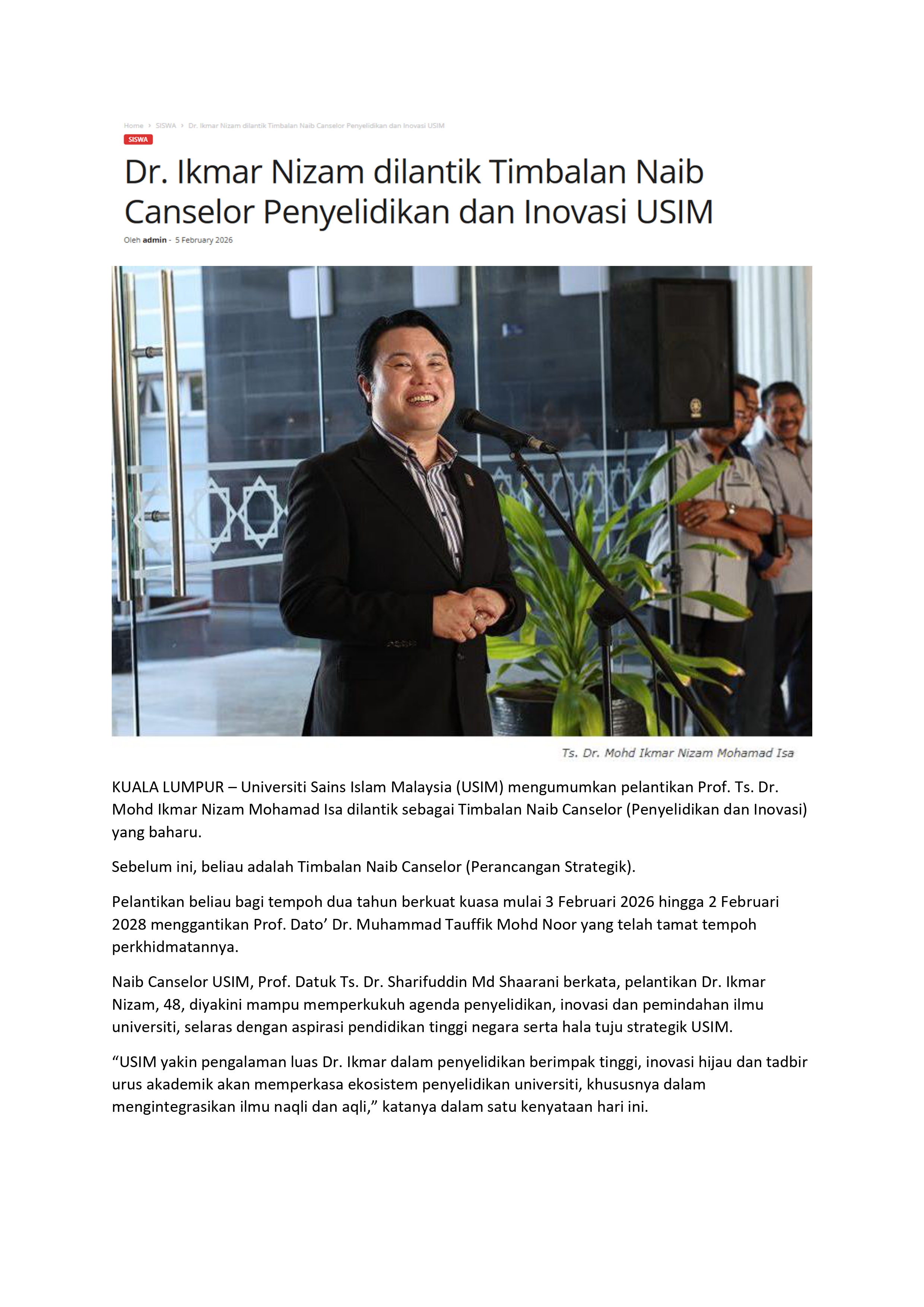 Dr. Ikmar Nizam dilantik Timbalan Naib Canselor Penyelidikan dan Inovasi USIM
