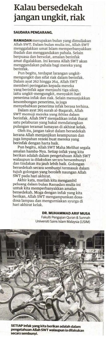 Kalau bersedekah jangan ungkit, riak