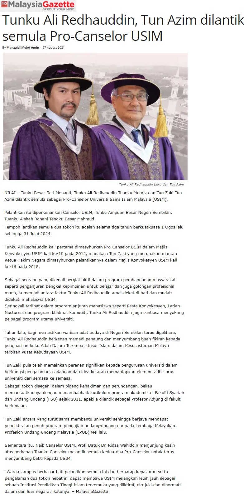 Tunku Ali Redhauddin Dan Tun Zaki Dilantik Semula Sebagai Pro-Canselor USIM