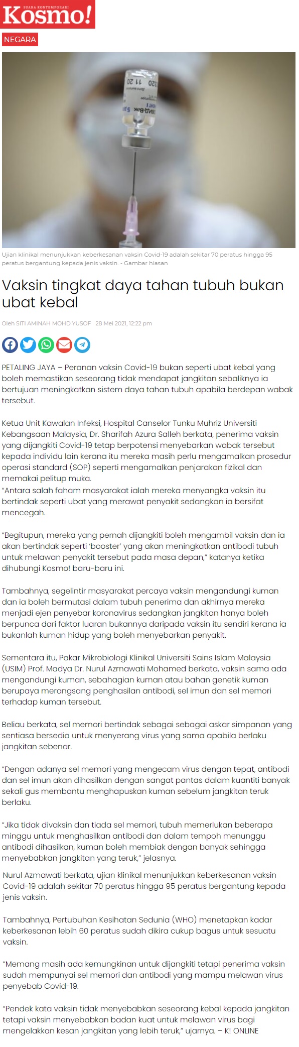 Vaksin Tingkat Daya Tahan Tubuh Bukan Ubat Kebal