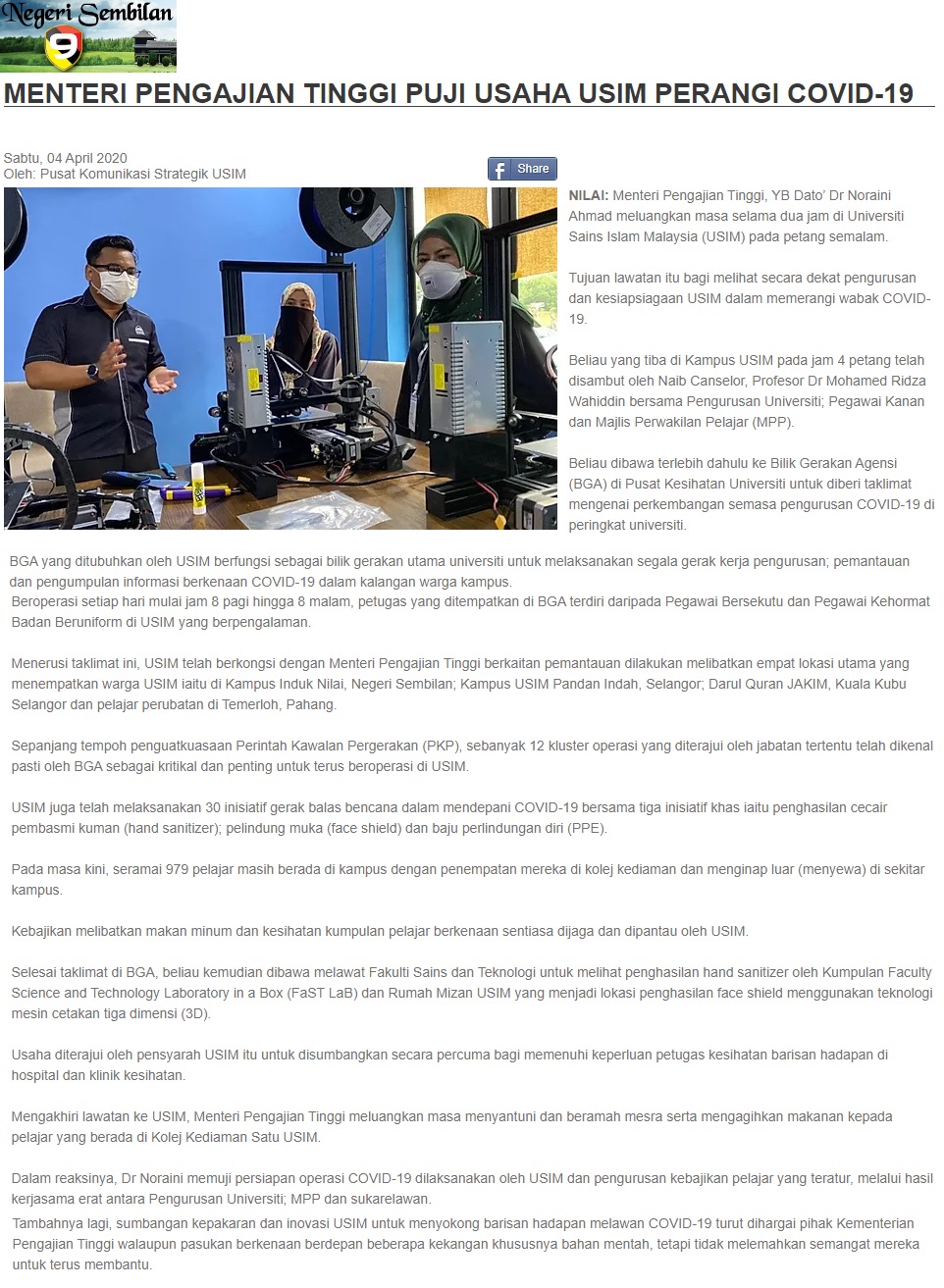 Menteri Pengajian Tinggi Puji Usaha USIM Perangi Covid19
