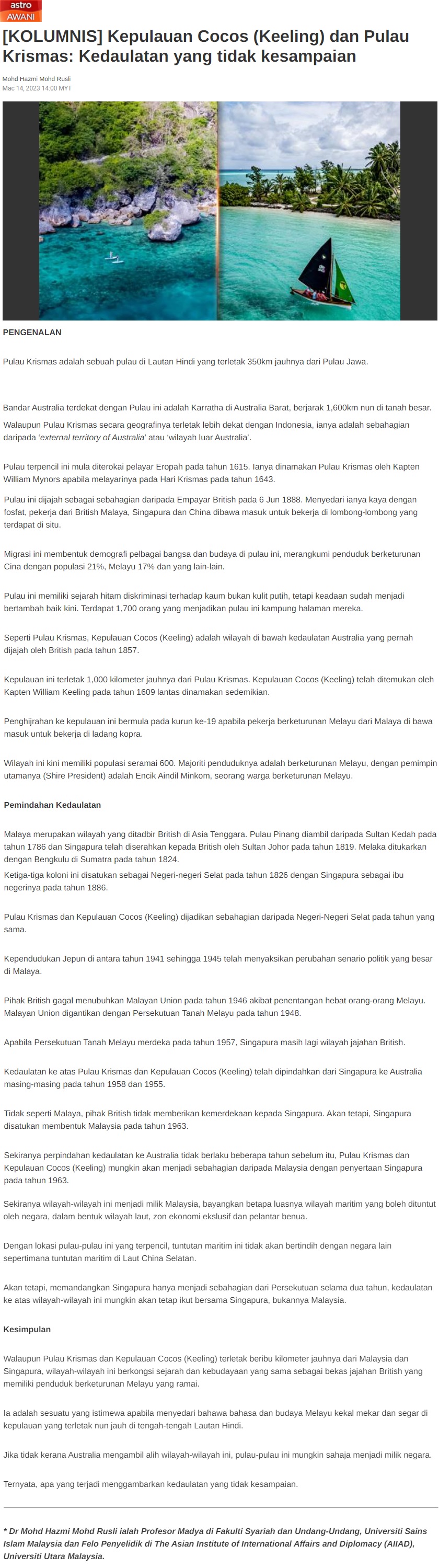 Kepulauan Cocos (Keeling) dan Pulau Krismas: Kedaulatan Yang Tidak Kesampaian