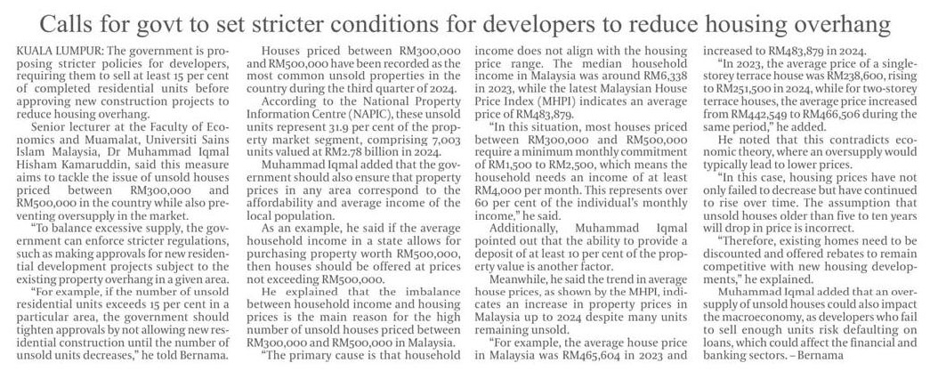 Calls for govt to set stricter conditions for developers to reduce housing overhang
