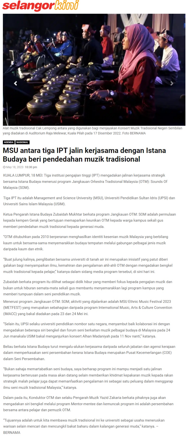 MSU antara tiga IPT jalin kerjasama dengan Istana Budaya beri pendedahan muzik tradisional
