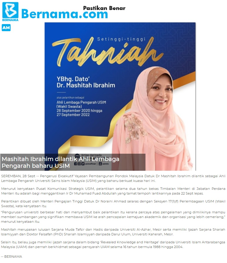 Mashitah Dilantik Sebagai Lembaga Pengarah USIM