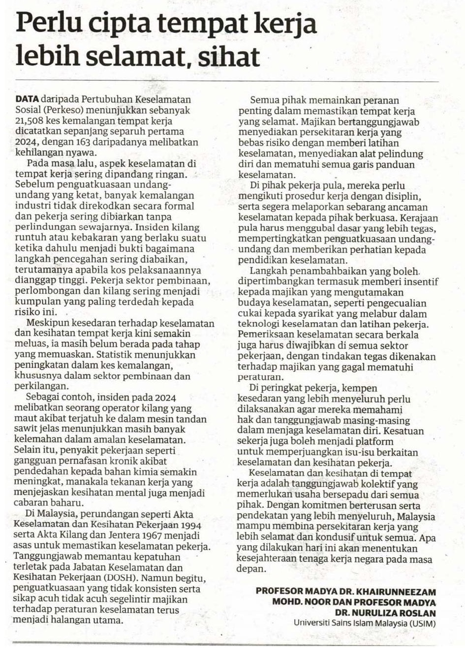 PERLU CIPTA TEMPAT KERJA LEBIH SELAMAT, SIHAT