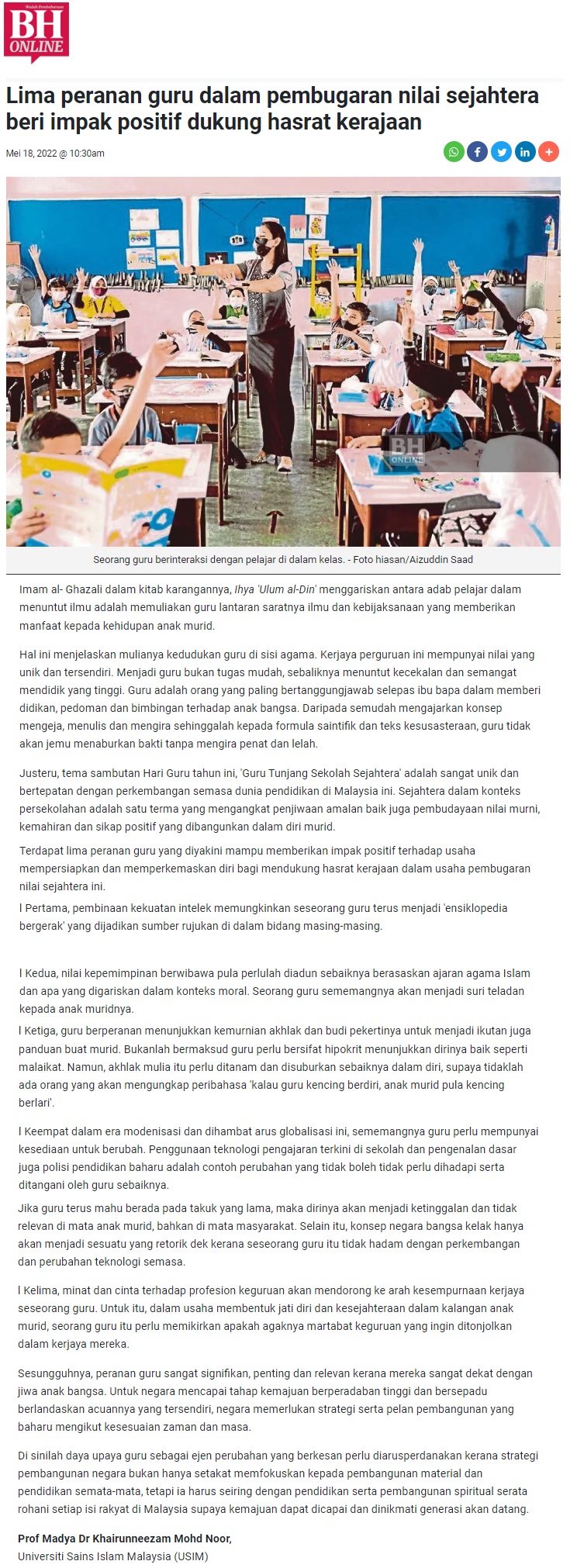 Lima Peranan Guru Dalam Pembugaran Nilai Sejahtera Beri Impak Positif Dukung Hasrat Kerajaan