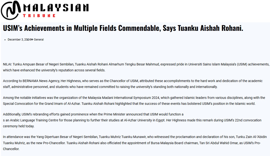 USIM's achievements in multiple fields commendable, says Tuanku Aisyah Rohani