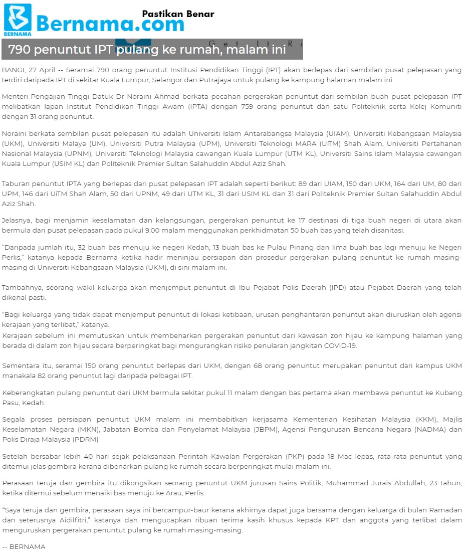 790 Penuntut IPT Pulang Ke Rumah Malam Ini