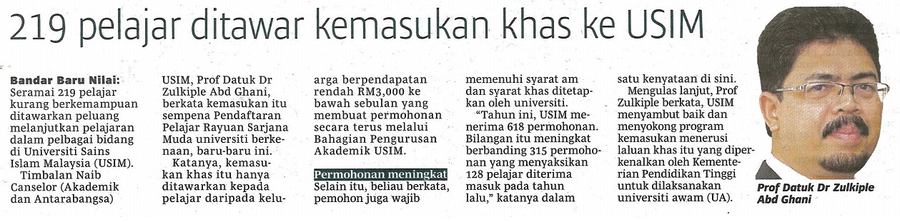BERITA HARIAN - 219 PELAJAR DITAWAR KEMASUKAN KHAS KE USIM, 28 SEPTEMBER 2017, MS V10 (VARSITI).jpg