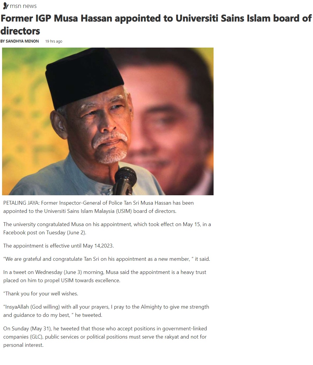 Former IGP Musa Hassan Appointed To Universiti Sains Islam Board Of Director