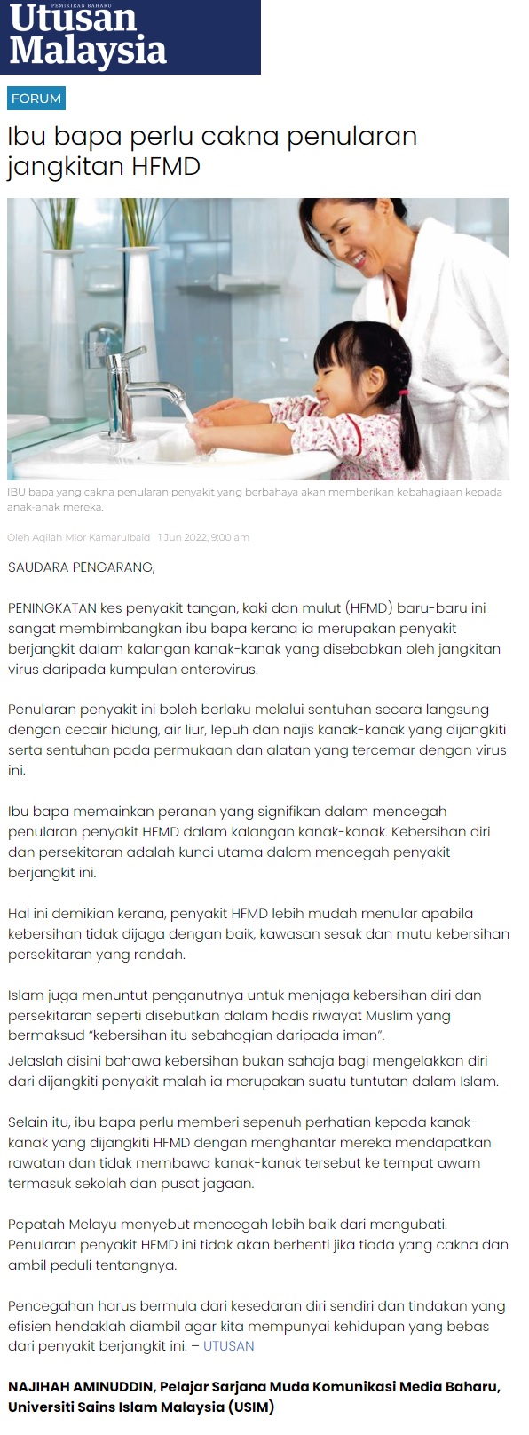 Ibu Bapa Perlu Cakna Penularan Jangkitan HFMD