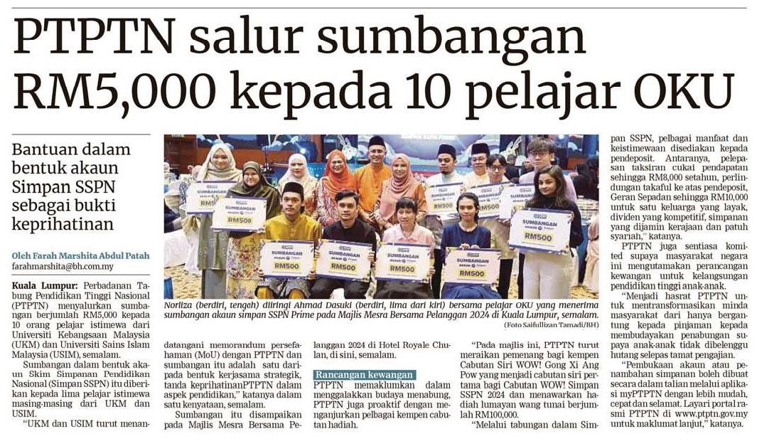 PTPTN salur sumbangan RM 5000 kepada 10 pelajar OKU