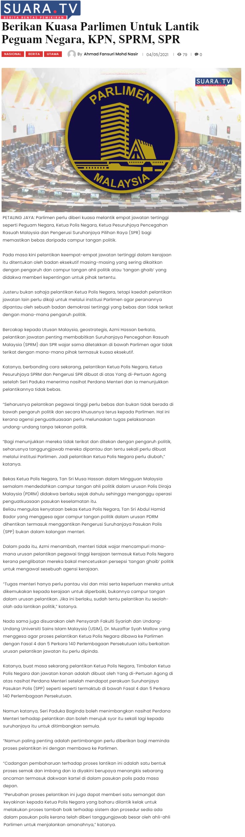 Beri Kuasa Parlimen Untuk Lantik Peguam Negara, KPN, SPRM, SPR