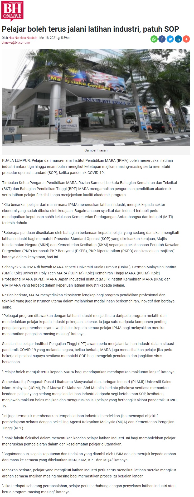 Pelajar Boleh Terus Jalani Latihan Industri, Patuh SOP