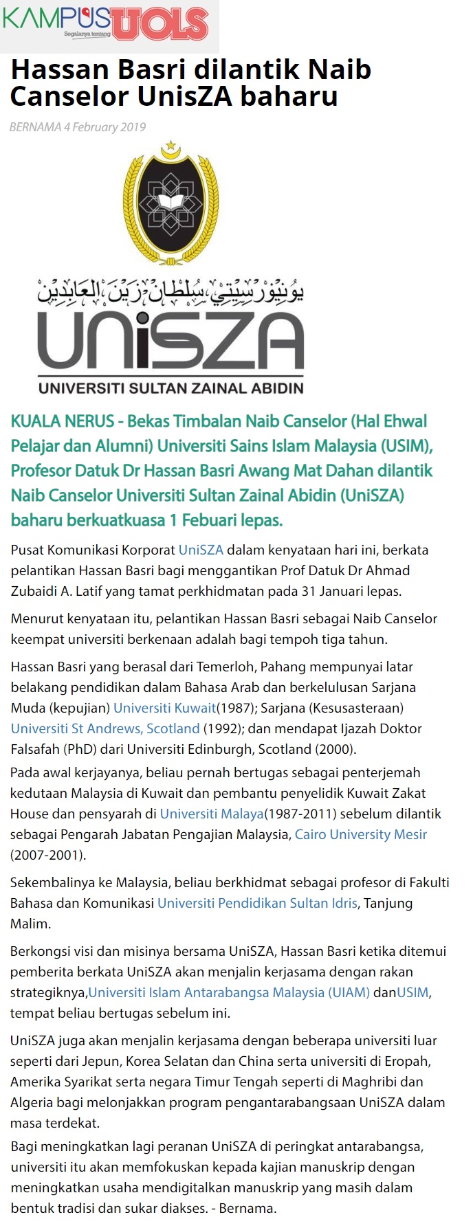 Hassan Basri Dilantik Naib Canselor UNISZA Baharu