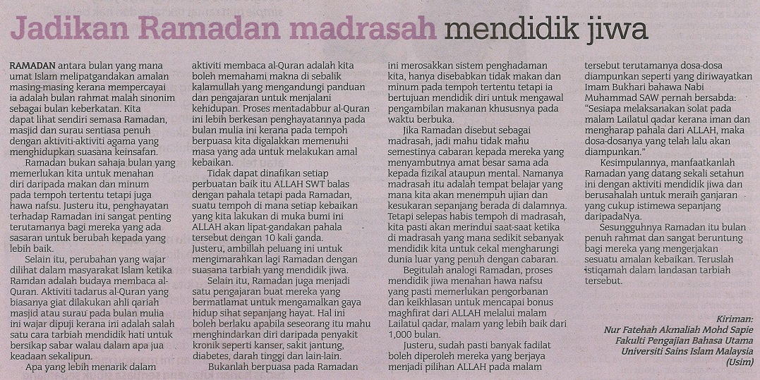 - SINAR HARIAN - JADIKAN RAMADAN MADRASAH MENDIDIK JIWA, 7 JUN 2017, MS 6 (KAMPUS).jpg