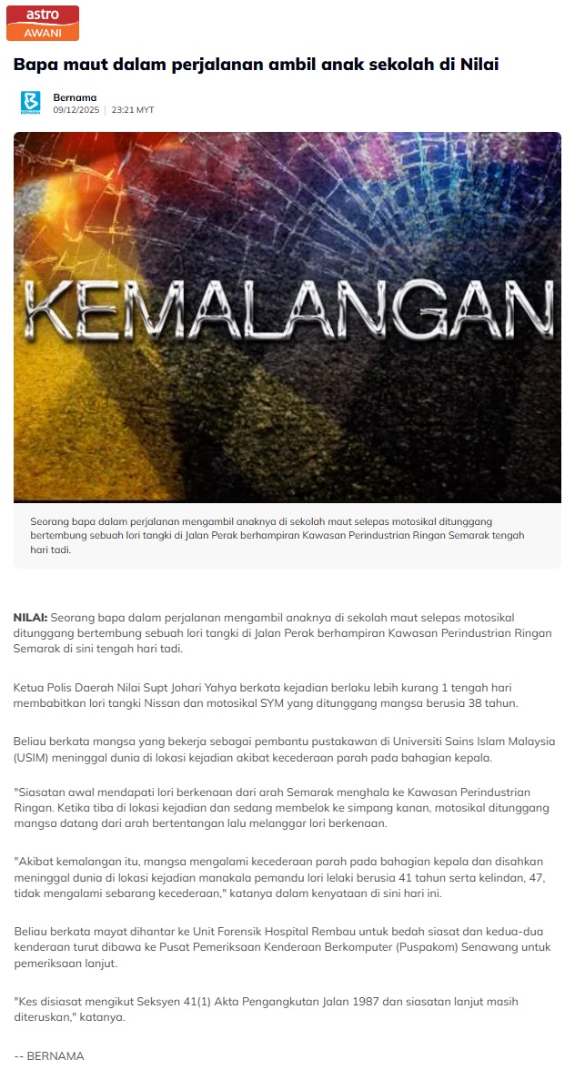 BAPA MAUT DALAM PERJALANAN AMBIL ANAK SEKOLAH DI NILAI