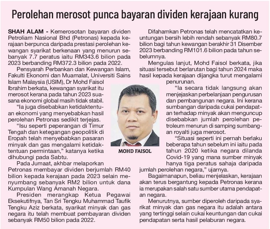 Perolehan merosot punca bayaran dividen kerajaan kurang
