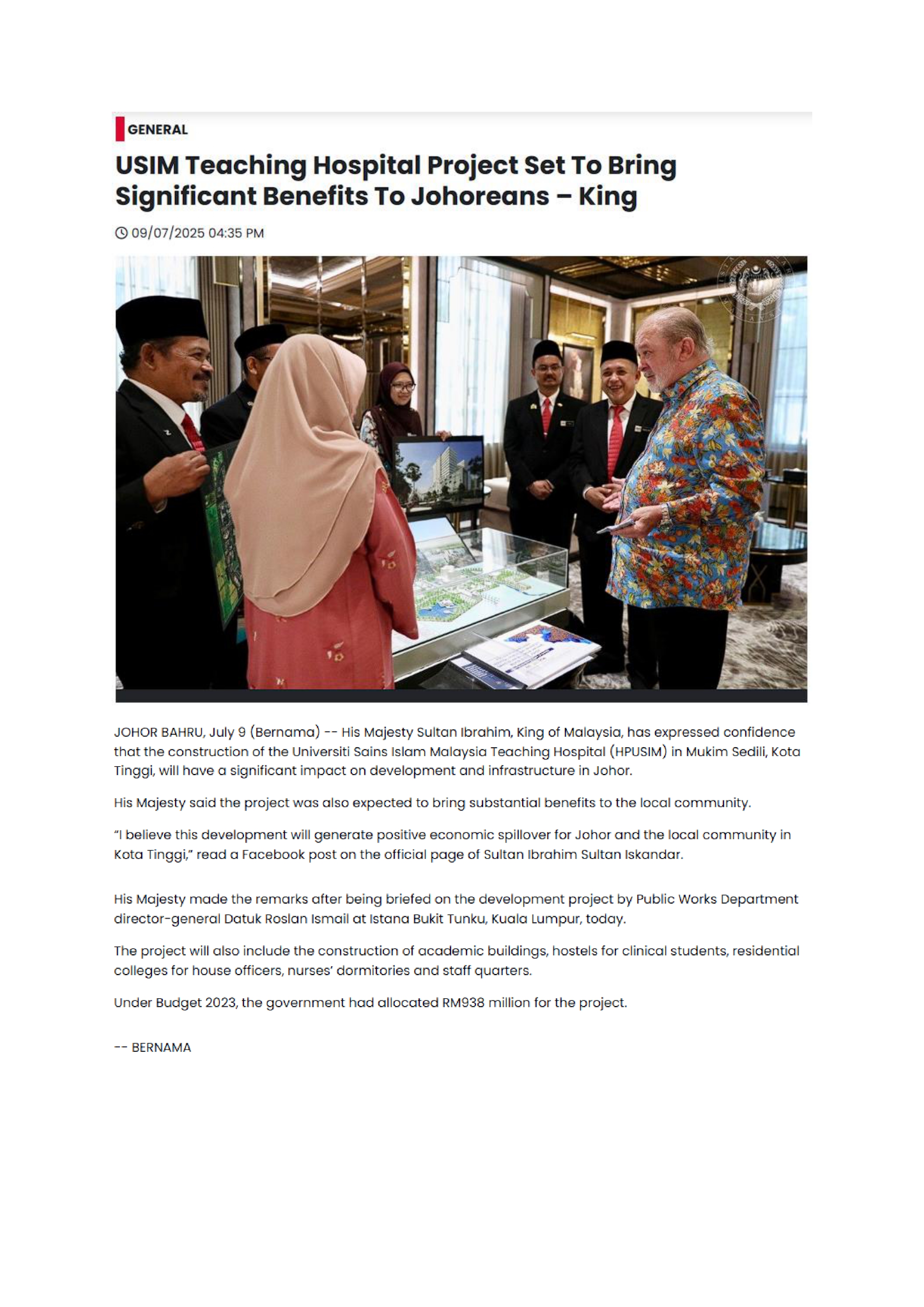 USIM Teaching Hospital Project Set To Bring Significant Benefits To Johoreans – King