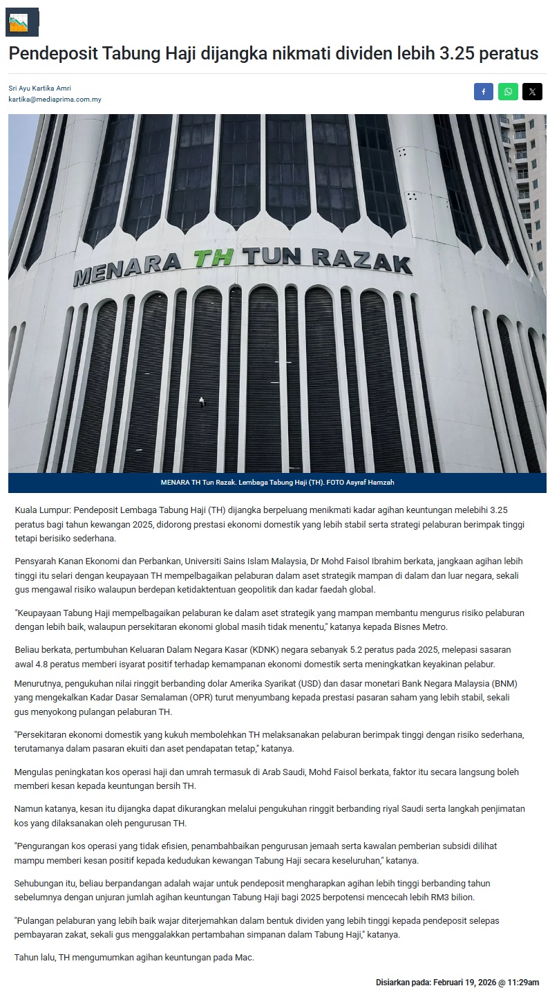 PENDEPOSIT TABUNG HAJI DIJANGKA DIVIDEN LEBIH 3.25 PERATUS