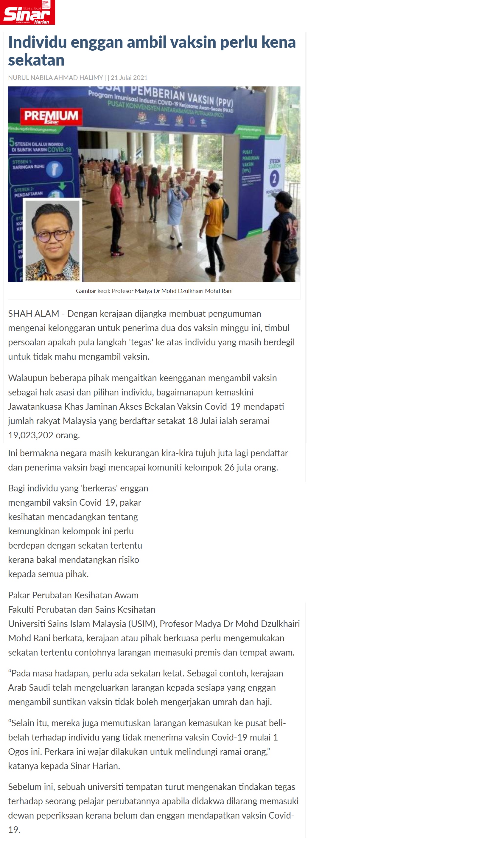 Individu Enggan Ambil Vaksin Perlu Kena Sekatan
