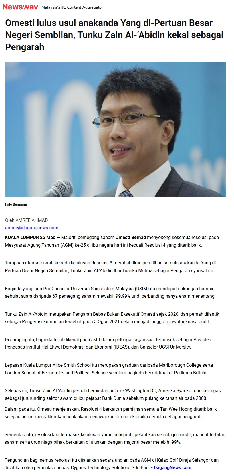 OMESTI LULUS USUL ANAKANDA YANG DI-PERTUAN BESAR NEGERI SEMBILAN, TUNKU ZAIN AL-‘ABIDIN KEKAL SEBAGAI PENGARAH