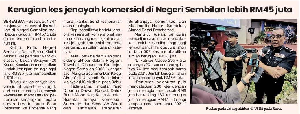 Kerugian Kes Jenayah Komersial Di Negeri Sembilan Lebih RM45 Juta