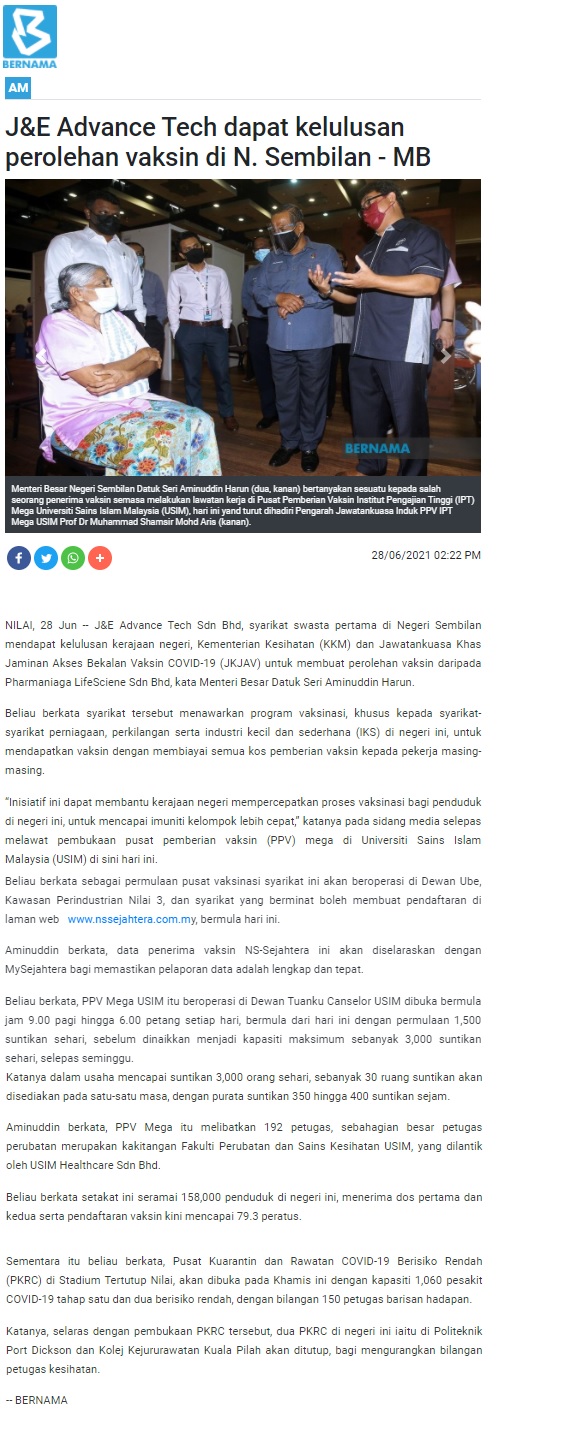 J&E Advance Tech Dapat Kelulusan Perolehan Vaksin Di N. Sembilan