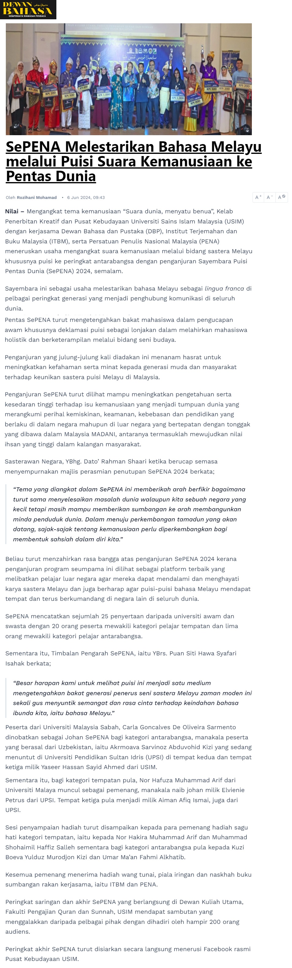 Sapena melestarikan Bahasa Melayu melalui puisi suara kemanusiaan ke pentas dunia