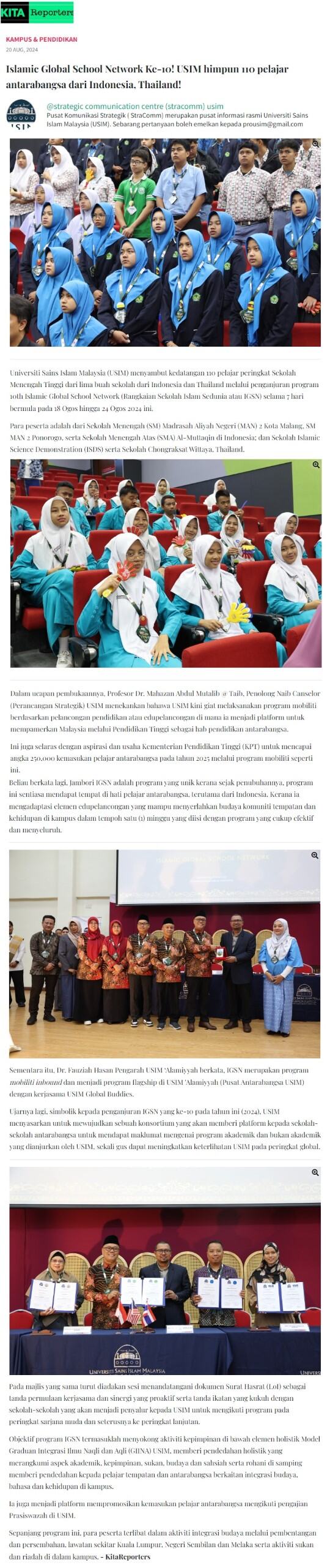 Islamic global school network ke 10 USIM himpun 110 pelajar antarabangsa dari Indonesia, Thailand