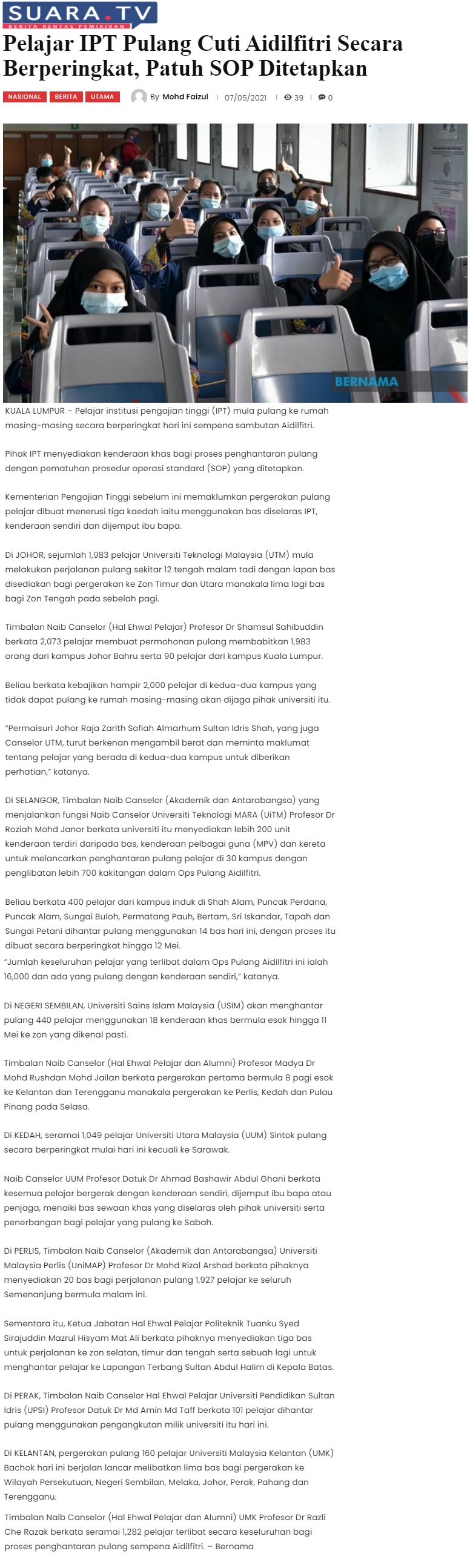 Pelajar IPT Pulang Cuti Aidilfitri Secara Berperingkat, Patuh SOP Ditetapkan