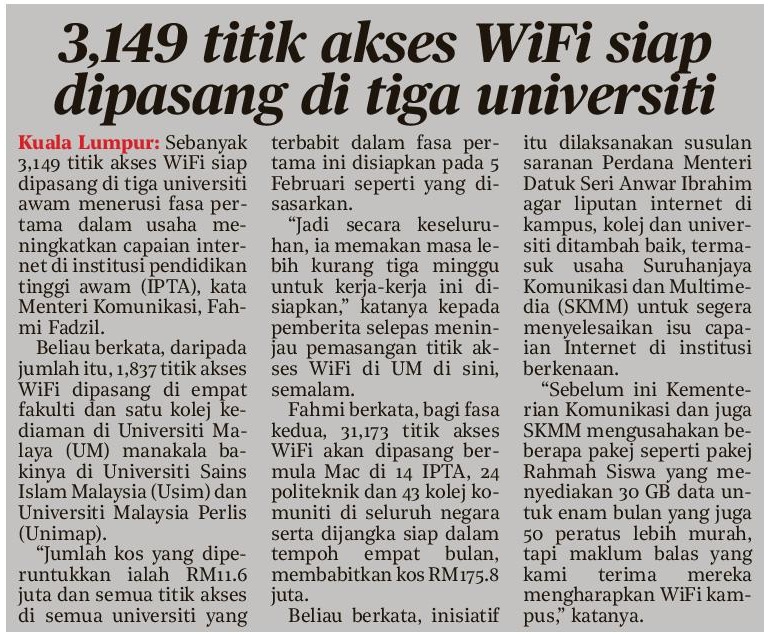 3149 titik akses WiFi siap dipasang di tiga universiti
