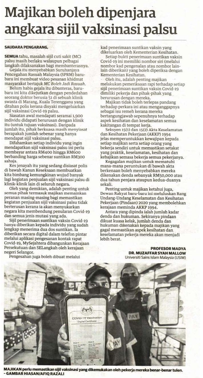Majikan Boleh Dipenjara Angkara Sijil Vaksinasi Palsu