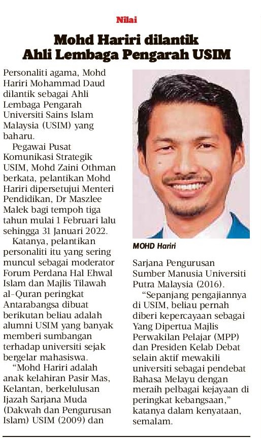 HARIAN METRO(N9) 9 FEBRUARI 2019 MS 28 MOHD HARIRI DILANTIK ANGGOTA LEMBAGA PENGARAH USIM BAHARU.jpg