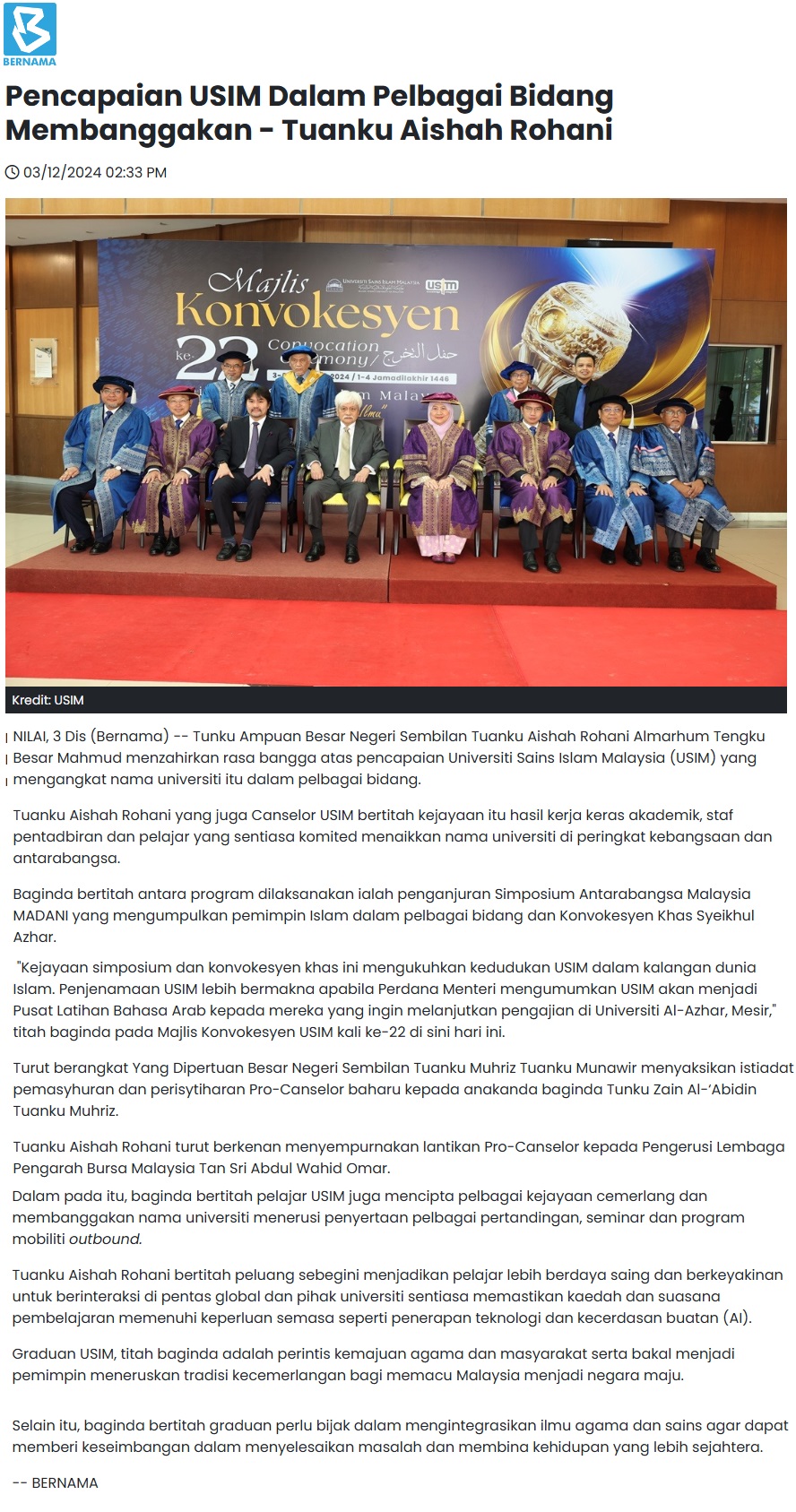 Pencapaian USIM Dalam Pelbagai Bidang Membanggakan - Tuanku Aishah Rohani