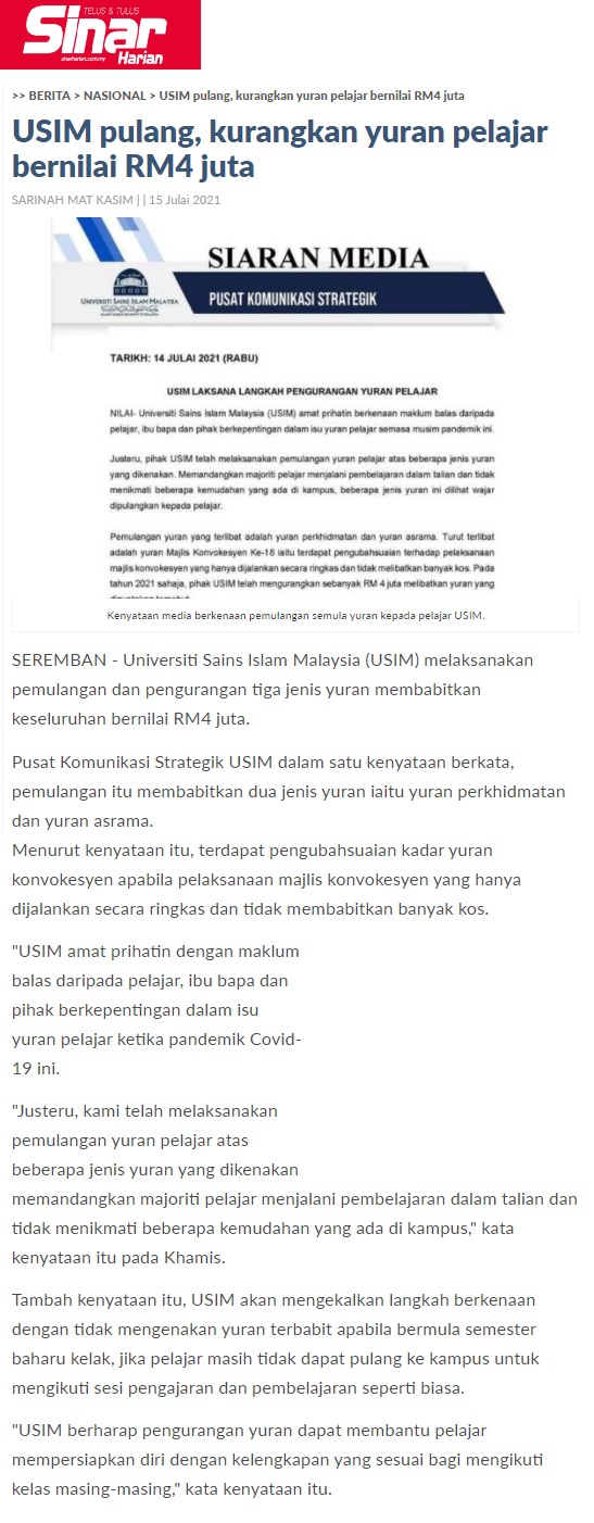 USIM Pulang, Kurangkan Yuran Pelajar Bernilai RM4 Juta