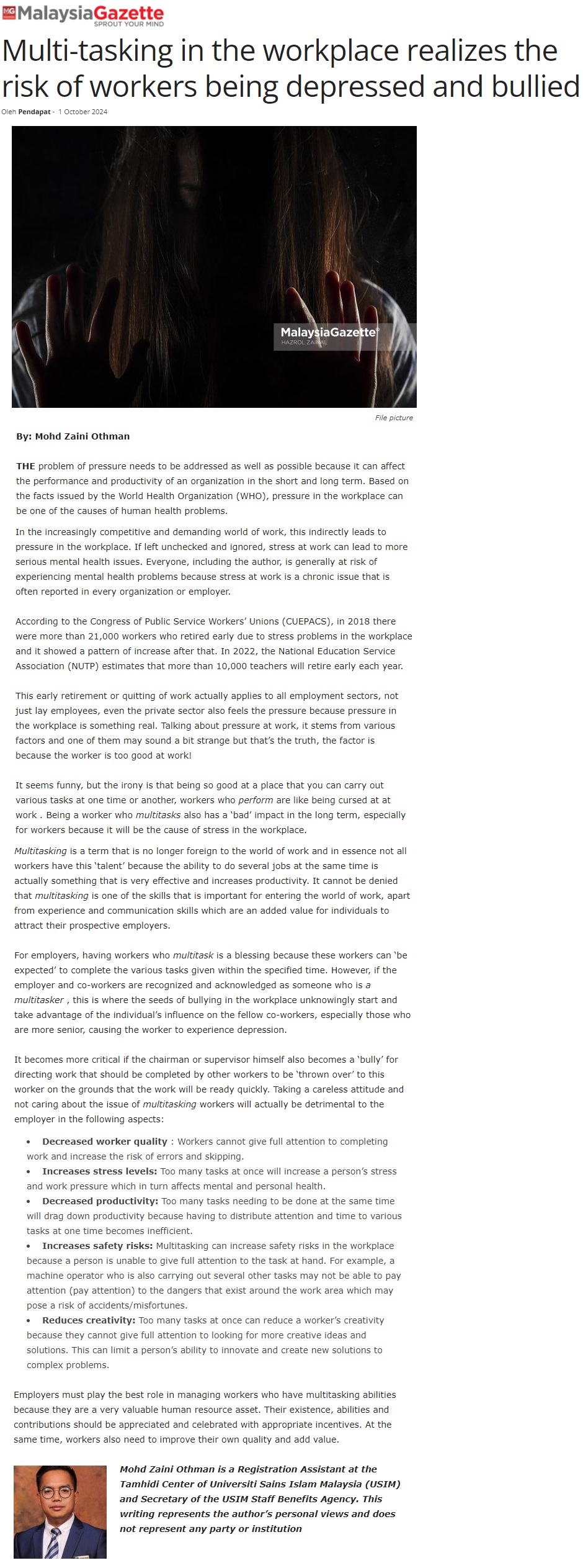 Multitasking in the workplace realizes the risk of workers being depressed and bullied