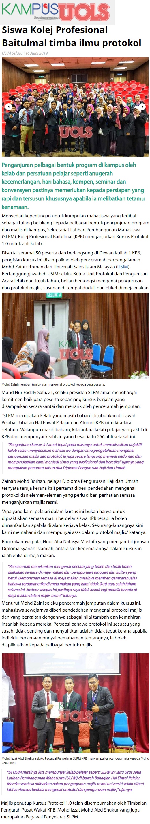 Siswa Kolej Professional Baitulmal Timba Ilmu Protokol